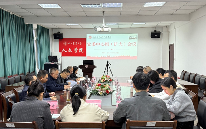 10月28日下午,人文学院召开党委中心组(扩大)会议,学习了《中国共产党第二十届中央委员会第四次全体会议公报》、学校党委《关于落实全面从严治党党委主体责任和纪委监督责任的实施意见》两个文件材料,并紧密结合学院工作实际,就学院“十五五”规划相关目标任务等进行了讨论。学院领导班子、党委委员、纪委委员、师生党支部书记,各系(室、部)主任、专业负责人、雨城区人大代表参加了学习会。会议由学院党委书记张禧主持。