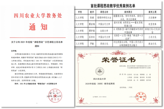 学院将课程思政作为落实立德树人的关键路径,推动所有课程担负起育人责任,扎实推进“三全育人”。学院鼓励教师深入挖掘所授课程中的思政元素,将中华优秀传统文化、社会主义核心价值观、家国情怀等有机融入教学内容,实现“润物无声”的育人效果。“十四五”期间,在全体教职工的努力下,学院开设的所有课程均撰写了课程育人大纲和课堂育人教案。学院获省级课程思政示范课程1门、校级课程思政示范课程3门,获首届全国农林高校课程思政优秀案例1个,获首批校级优秀课程思政案例5个,1个专业被评为校级一流课程思政示范专业,《新文科背景下农林高校汉语言文学专业课程思政教学体系研究与实践》获校级本科教学成果奖二等奖。