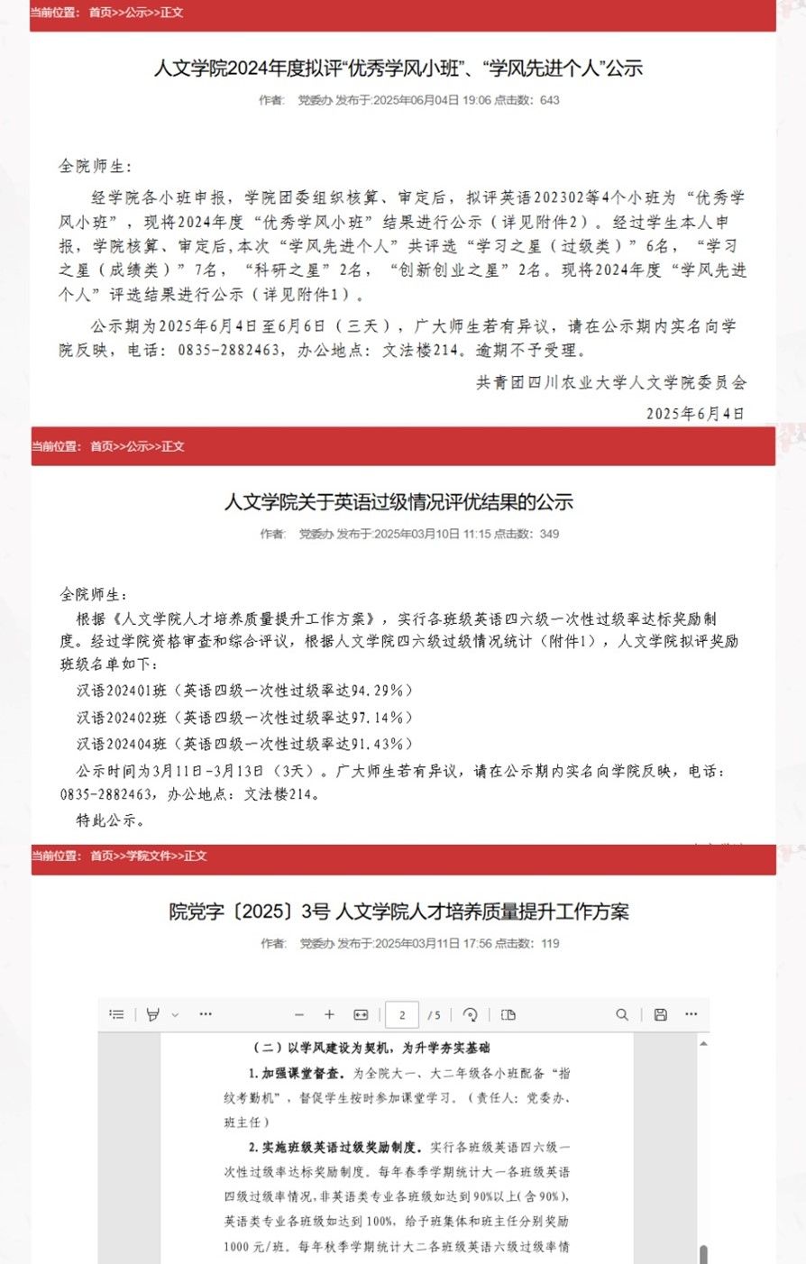 守正与创新的同频共振,最终汇聚成学院学生全面发展的丰硕成果。学业水平稳步提升。在全院师生的共同努力下,学院学风状态数据持续向好,升学率达26.59%,英语四级过级率在90%以上、英语六级考试过级率在60%以上。综合素质显著增强。学院坚持“五育并举”,将学风建设与文体活动、创新实践深度融合,既锤炼学生专业本领,又提升综合素质,助力学生全面发展。积极举办拔河比赛、国学经典诵读大赛、班徽班训设计大赛等特色活动,既为学生提供展现自我、切磋交流的平台,又增强班级凝聚力与集体荣誉感。在2024年度《学生体质健康标准》测试中,学院荣获“先进集体”称号,充分彰显人文学子强健的体魄与积极向上的精神风貌。