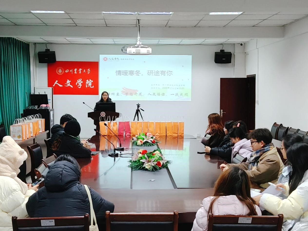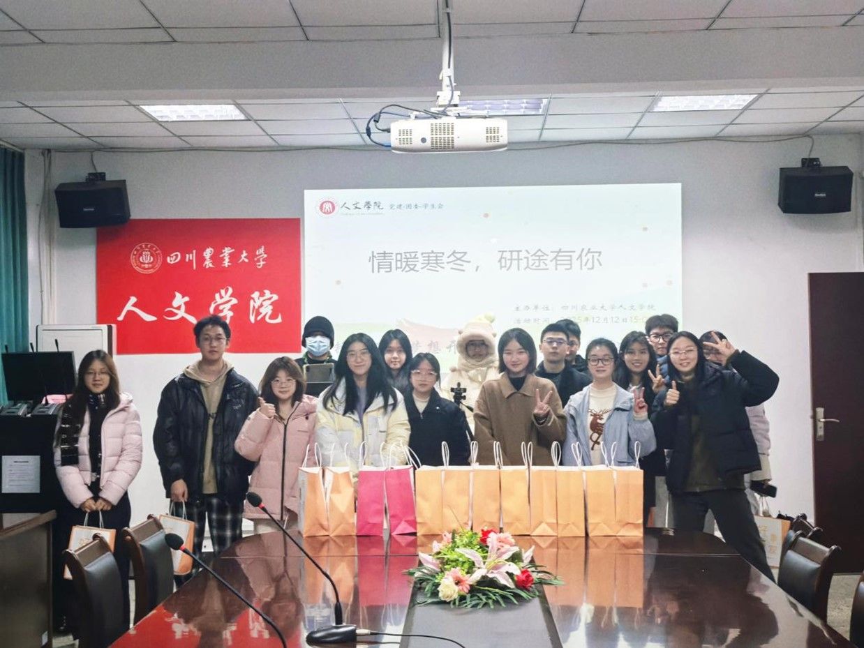 2026年全国硕士研究生入学考试初试的大幕即将拉开,我院2026届考研学生正全力冲刺。为舒缓2026届考研学生在备考期间的心理压力,帮助其以更为沉稳平和的心态迎接考试,做好“最后一公里”服务工作,人文学院于12月12日15:00,在文法楼212会议室组织了“情暖寒冬,研途有你”活动,为每一位在考研征途上奋勇拼搏的学子送上专属的冬日暖心礼包。