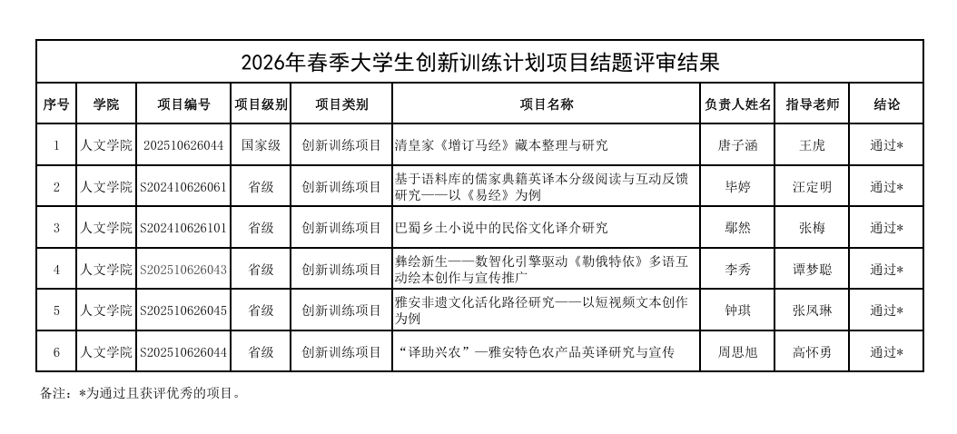 近日,根据教务处《关于2026年春季大学生创新训练计划项目结题评审结果的公布》的通知,人文学院2026年春季大学生创新创业训练计划项目顺利结题6项,包含1项国家级项目、5项省级项目,详见下方表格。我院2026年春季大学生创新创业计划项目申请结题的6项均顺利结题,充分体现了人文学子出色的创新精神、创业意识与实践能力,也是学院持续深化创新创业教育与专业融合、注重培养学生实践能力的生动体现。学院将持续完善育人体系,强化成果转化扶持,鼓励更多学生投身创新创业实践,培养敢闯会创的新时代青年。