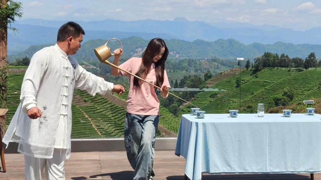 随后,全体师生观看“龙行十八式”茶技表演。表演者手持长嘴铜壶,翻转腾挪,水柱精准入盏。表演结束后,来自老挝的留学生王悦晗和来自柬埔寨的兴秀江作为代表,上台体验长嘴铜壶的基本动作,在表演者的指导下尝试提壶、出水的招式,赢得现场阵阵掌声。