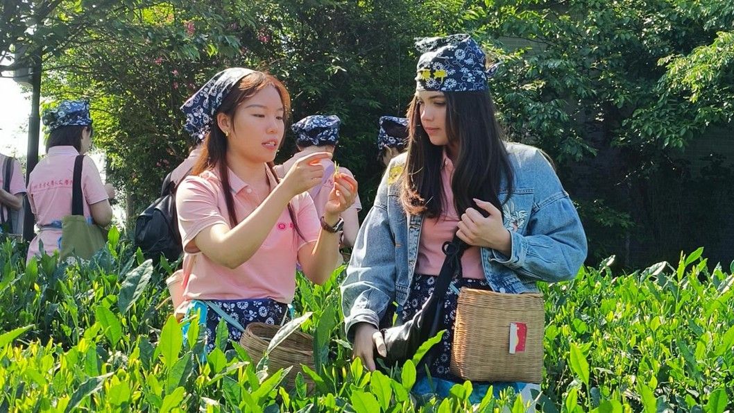 18日上午,在当地茶农的悉心指导下,中外学生混合编组,认真学习“一芽一叶”的标准手法。许多同学都是初次体验采茶,茶园间不时传来中外学子兴致盎然的交流与探讨声,氛围热烈而融洽。