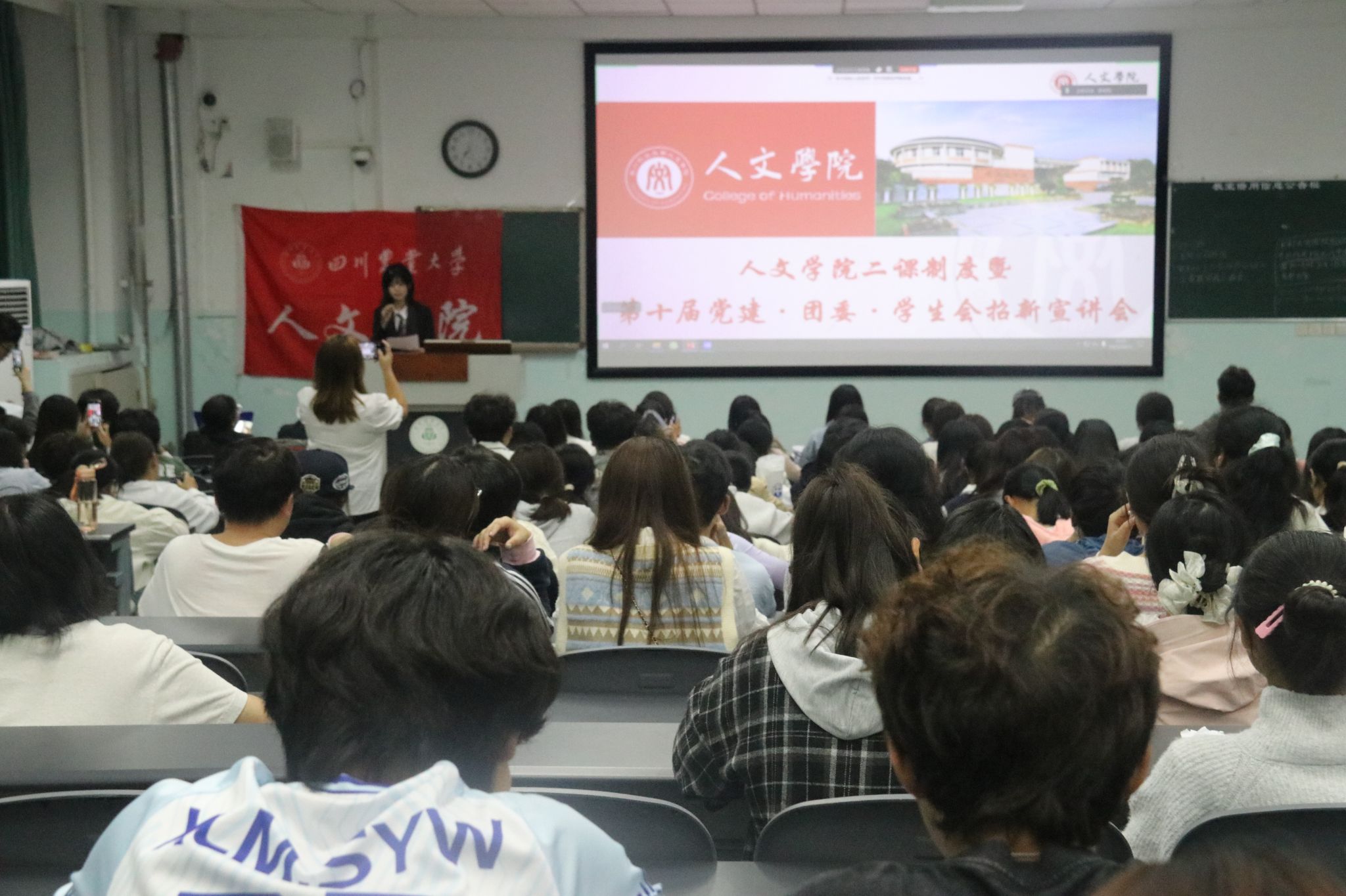 为深入贯彻落实立德树人根本任务,引导新生科学规划大学生涯,10月12日晚,人文学院在101与103教室隆重举行“第二课堂”政策宣讲会暨学生组织招新宣传活动。活动由人文学院党建、团委、学生会联合主办,面向全体2025级新生,系统解读学校人才培养政策,全面展示学生组织职能与风采。