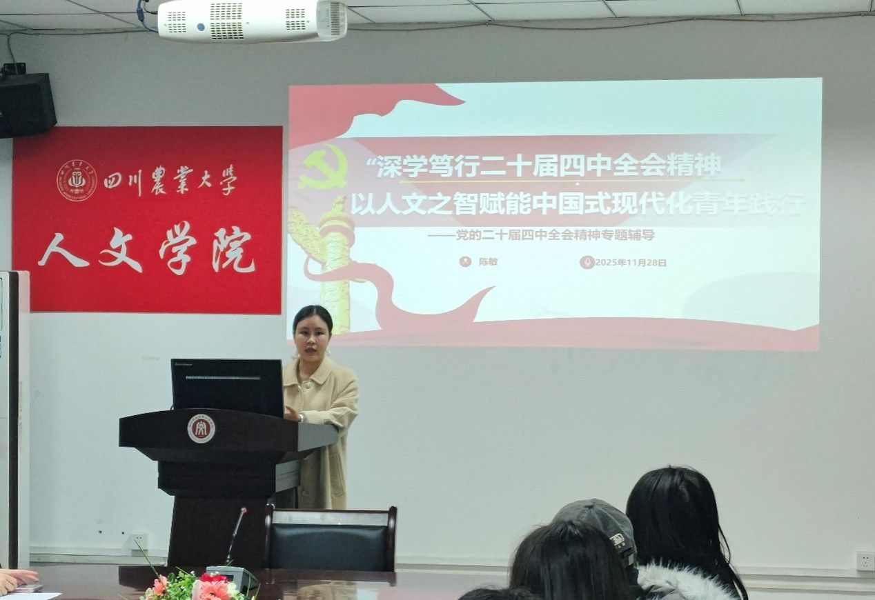 为深入学习贯彻党的二十届四中全会精神,引导广大师生准确把握国家发展大局与时代使命,11月28日,人文学院党委办公室副主任、团委副书记陈敏老师在文法楼212室开展党的二十届四中全会精神专题辅导,以“深学笃行党的二十届四中全会精神,以人文之智赋能中国式现代化青年践行”为主题,为师生系统解读全会核心要义与战略部署。
