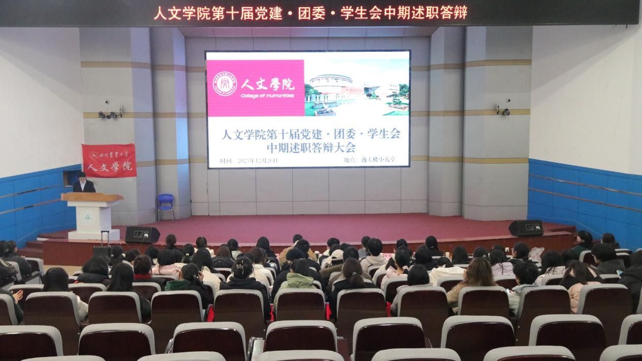 为全面展示学生工作成果、广泛听取学院师生对学生工作的意见与建议,12月26日16:30,人文学院第十届党建·团委·学生会中期述职答辩大会于逸夫楼小礼堂成功举办。本次大会特邀人文学院党委办公室副主任、团委副书记陈敏老师出席指导。人文学院第十届党建·团委·学生会主席团成员、全体主干、各部门干事以及各小班班长和团支书共同参会。会议由学生人力资源中心陈俊铭主持,分为主席团述职及各部门述职答辩两个部分。