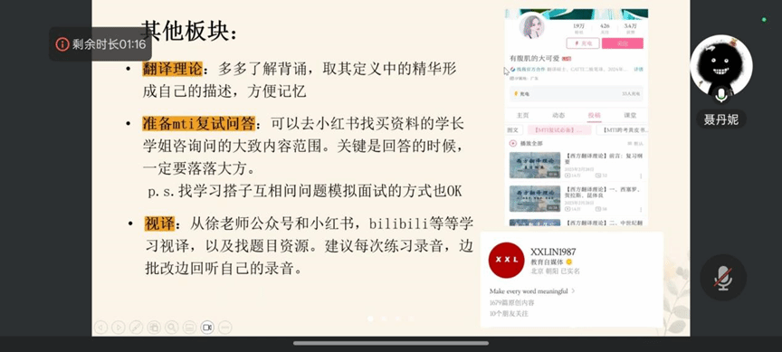 分享会上,受邀的同学分专业展开针对性分享,精准适配英语、汉语言文学专业需求。英语专业,李润、聂丹妮详解复试笔试与面试,分享自我介绍打磨技巧,推荐优质学习资源,建议大家利用AI模拟面试、影子跟读法等提升口语,同时复用初试笔记高效备考,注重提升中英文切换应答能力。此外,李婵媛、曲比曲子分享通用技巧,结合自身经历强调信息搜集的重要性,分享临场应对技巧和心态调整方法,就模拟面试、导师联系、考场礼仪等细节倾囊相授。汉语言文学专业,李奕彤提到复试需结合专业细分领域准备,笔试参考往年真题,面试重点考察专业基础与学术潜力。她建议同学们构建知识体系,提前研究目标导师学术方向,借助模拟面试查漏补缺,同时关注复试分数构成、复录比及调剂相关信息。