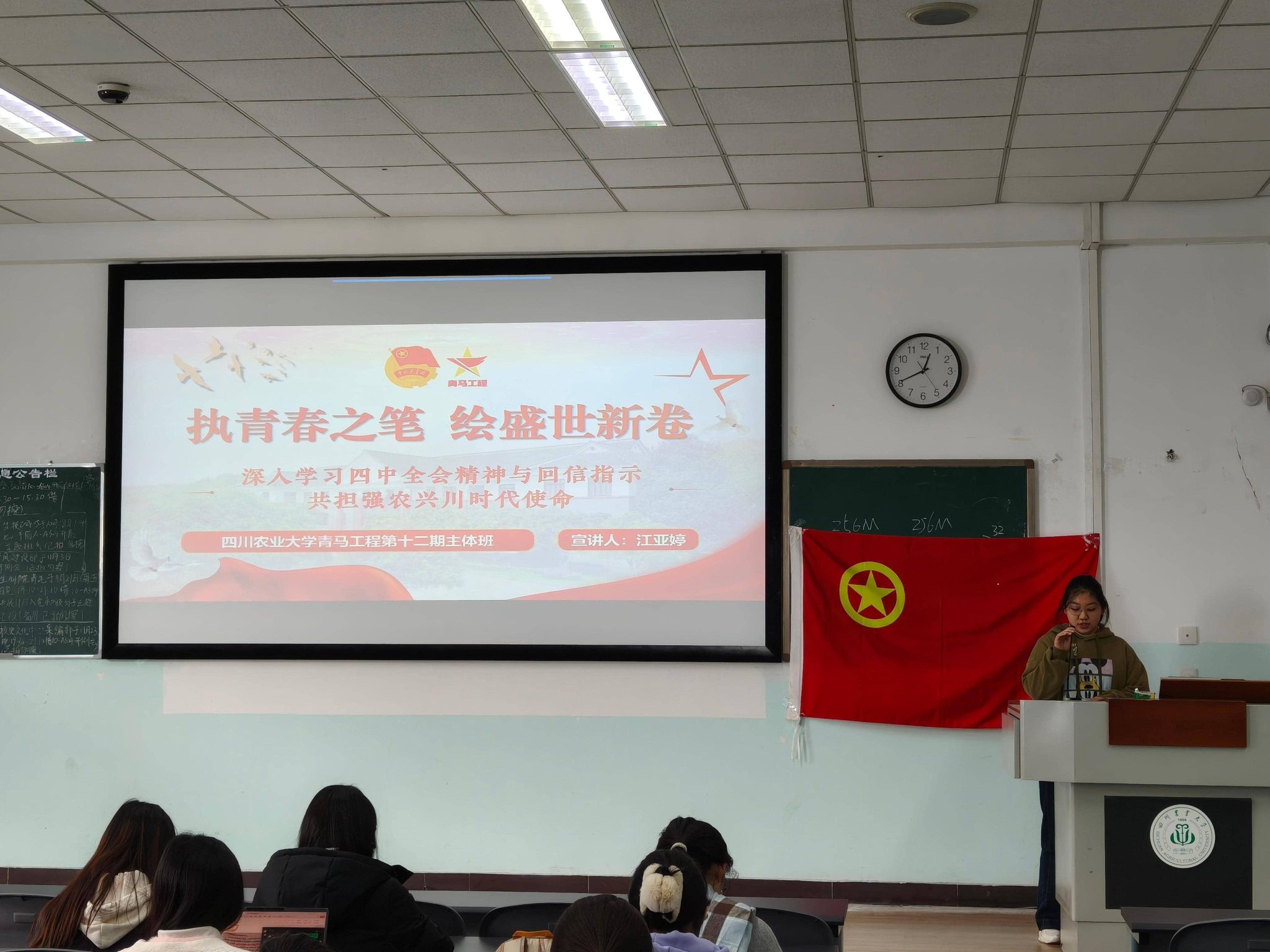 本期课程中,江亚婷首先围绕“读懂盛世新意”“锤炼青春之笔”“共绘时代华章”三大板块,结合党的二十届四中全会精神与“四信”指示,引导同学们深刻理解国家发展新阶段的历史方位与青年使命。然后她指出,党的二十届四中全会不仅为国家发展擘画了新蓝图,也为广大青年指明了奋斗方向——要把“小我”融入“大我”,在“强农兴川”的时代使命中展现川农担当。最后在谈到“青春何为”时,她结合学校“青马工程”培养体系和多位优秀学员案例,鼓励团员骨干努力成长为政治坚定、能力突出、作风扎实的青年政治骨干、团学组织骨干与大学生骨干,在班级建设、网络空间与团学实践中积极作为,锤炼真本领,传播正能量。