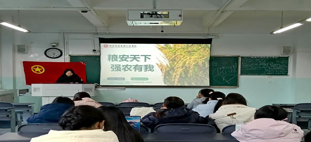 为了让青年学生认清粮食安全的战略意义,唤醒大家投身强农事业的青春责任感。12月5日,人文学院2025下半年新发展团员第七期团校于10-A311成功开展。本次活动由人文学院团委组织部举办,特别邀请第十届学生会主席王李灵为主讲人。
