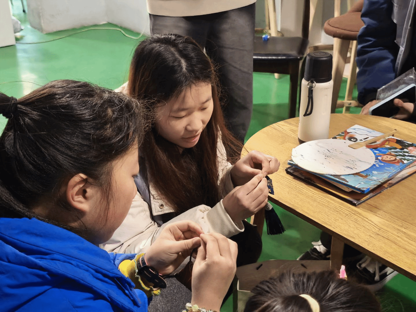 在动手实践环节,志愿者采取了直观生动的教学方式。他们手持香囊半成品,边讲解边示范每一个制作步骤。小朋友围坐在工作台前,眼睛紧紧盯着志愿者的每一个动作,小手也不由自主地跟着比划。当志愿者演示完一个步骤后,小朋友立即拿起自己的材料开始模仿制作。从穿针引线、布料缝合,到填充清香的艾草、系上精致的流苏,每一个环节都是在志愿者示范、小朋友模仿、志愿者指导纠正的循环中完成的。一个小朋友刚开始缝制时针脚有些凌乱,志愿者便再次放慢动作示范,手把手教他掌握技巧。这种“我做一步,你跟一步”的教学方式,让复杂的传统工艺变得清晰易懂。孩子们在模仿中学习,在操作中领悟,当看到自己手中的香囊渐渐成形时,他们的脸上露出了自信的神情。活动现场洋溢着浓厚的学习氛围,传统手工艺的传承在细致入微的互动中悄然实现。小朋友们举起自己完成的作品,互相展示、嗅闻彼此香囊的独特香气。