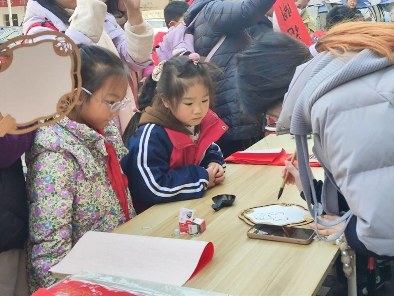 随后,四位擅长书法的同学现场挥毫泼墨,一幅幅寓意吉祥的春联与福字跃然纸上。经典的春联词句搭配遒劲有力的笔墨,引得围观居民连连称赞。不少居民纷纷上前挑选心仪的春联内容,有的偏爱喜庆热烈的新春贺词,有的则希望定制带有家庭期盼的专属春联。一位年过七旬的社区书法爱好者也被现场氛围感染,主动拿起毛笔参与书写,他写下的“国泰民安逢盛世,风调雨顺颂华年”刚劲洒脱,与学生们的作品相映成趣,现场赞叹声此起彼伏。恰逢中小学放学时段,不少小朋友在家长的陪同下围拢过来,活动现场瞬间变得更加热闹。与此同时,志愿者们穿梭在人群中,小心翼翼地将刚写好的春联移至预先准备好的晾纸区,用夹子固定在绳子上,避免墨迹沾染或被风吹乱,待墨迹完全干透后,再仔细卷好装入纸袋,递到居民手中。团队还准备了印有校徽的文创书签,作为小礼品赠送给参与活动的居民,进一步拉近与社区群众的距离。