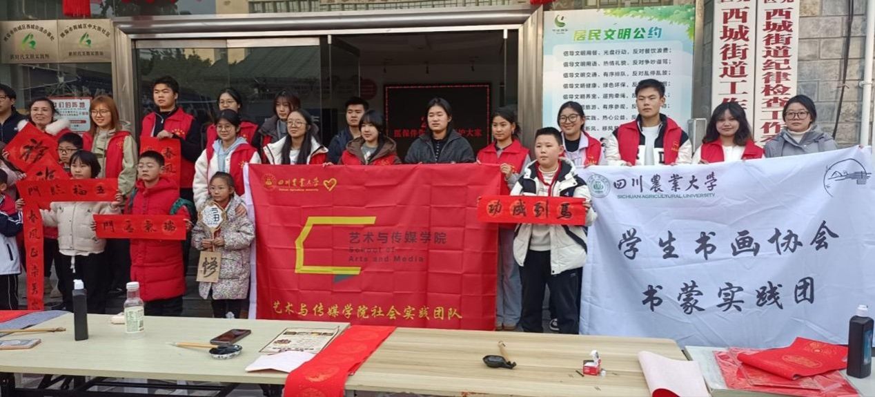首先,实践团成员提前抵达活动现场,迅速投入到场地布置工作中。大家分工明确、配合默契,一部分成员负责搬运桌椅、悬挂代表四川农业大学学生书画协会书蒙实践团的旗帜,另一部分成员仔细悬挂已经写好的春联,还有成员将毛笔、纸张等书写工具整齐摆放至桌面,并贴心准备了装春联的环保纸袋,方便居民取用。同时,团队专门设置志愿服务引导岗,安排专人负责秩序维护与咨询解答,确保活动能够有序开展。