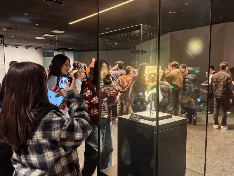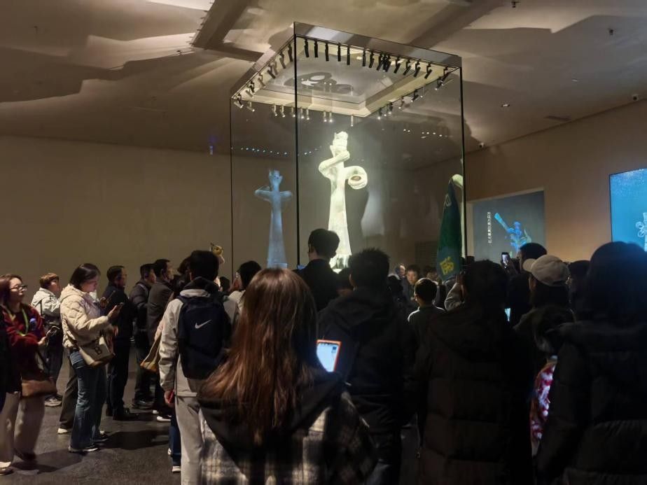 在互动体验区,小队成员从“旁观者”变身“参与者”,沉浸式感受文物“活起来”的魅力。部分队员还体验了“天地回响”数字艺术剧场,在16K分辨率穹幕与空间沉浸音响的加持下,仿佛穿越至古蜀王国,直观感受祭祀仪式的庄严氛围,深切领略科技与文化融合的独特魅力。