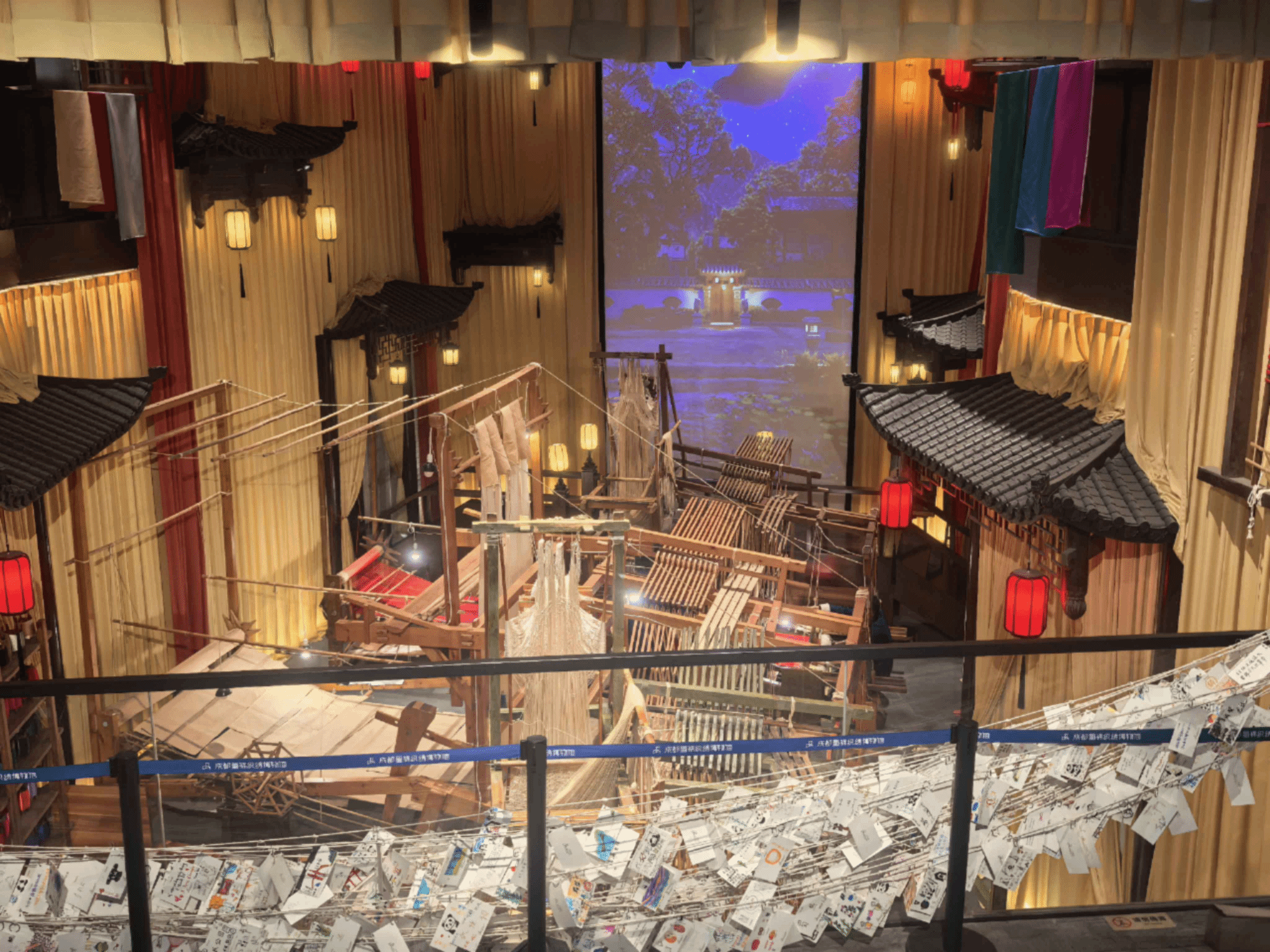 在专业讲解员刘霞带领下,团队首先系统参观了“古蜀丝语”“汉锦神韵”“盛唐卓越”“明清服饰”等主题展厅。从三星堆丝织物残片到唐代“陵阳公样”,再到明清“月华”“雨丝”“方方”三绝纹样,队员们直观感受了蜀锦从战国贸易传奇到唐代作为国礼远渡东瀛的辉煌历程。在“灯笼纹”专题展区,队员们深入了解了这一宋代标志性纹样“五谷丰登”的民俗寓意,通过清代实物展品加深了对传统纹样的理解。