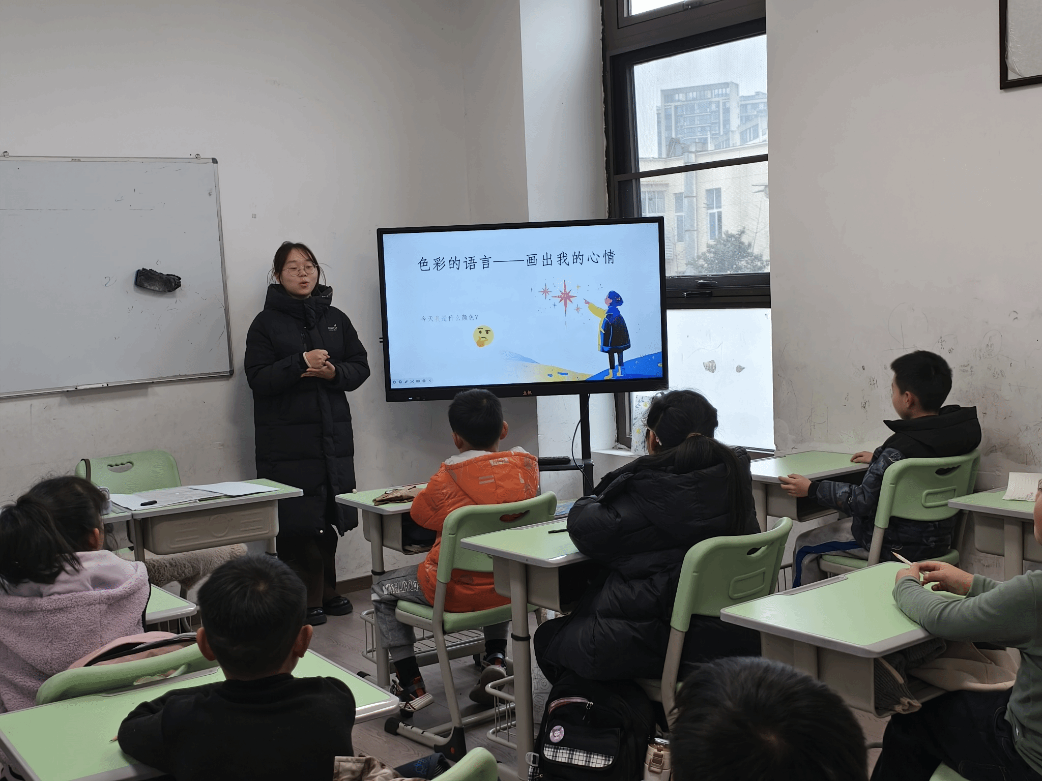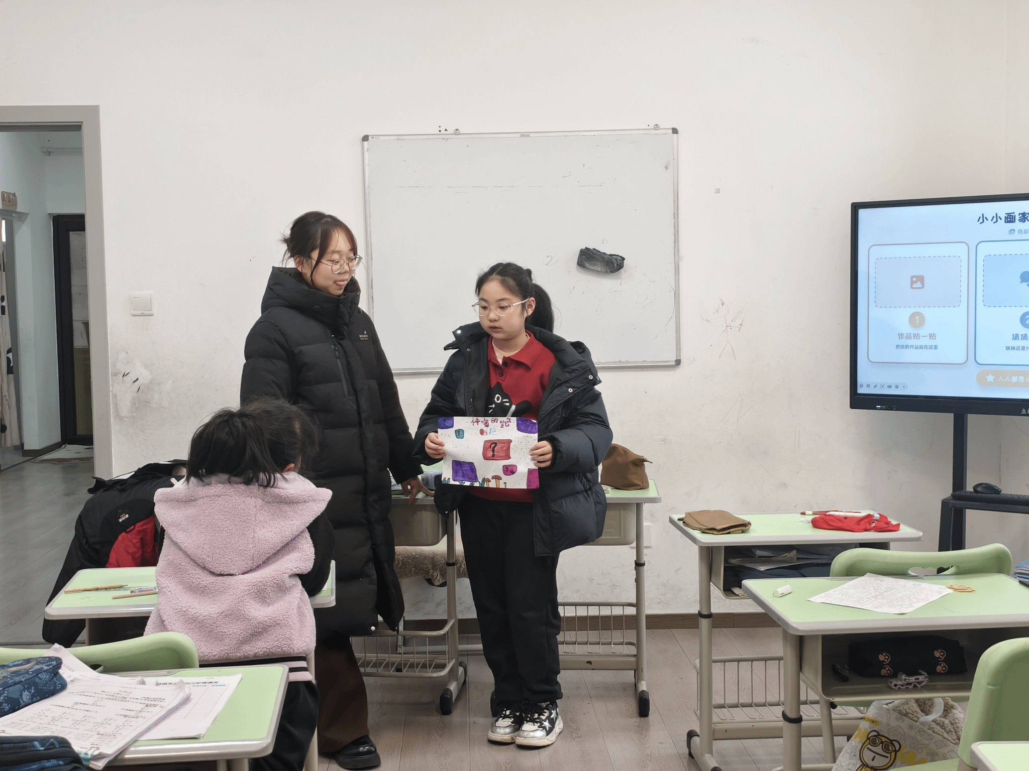接着,志愿者宋捷在其余助教的帮助下,开展了“色彩的语言”创意美术课程。在美术课上,志愿者宋捷以简单的小游戏作为课堂导入,为孩子们介绍了梵高的《向日葵》、毕加索的《里埃拉德胜琼的晨曦》等著名画作。同时,她还鼓励孩子们自己动手画画,勇敢大方展示画作。最后,宋捷引导孩子们回顾本堂课的内容,鼓励孩子们在生活中去发现美,寻找美。看着自己手中的画作,孩子们脸上都洋溢着微笑与满足。这场别出心裁的美术课更好地培养了孩子们的创造力和观察力。