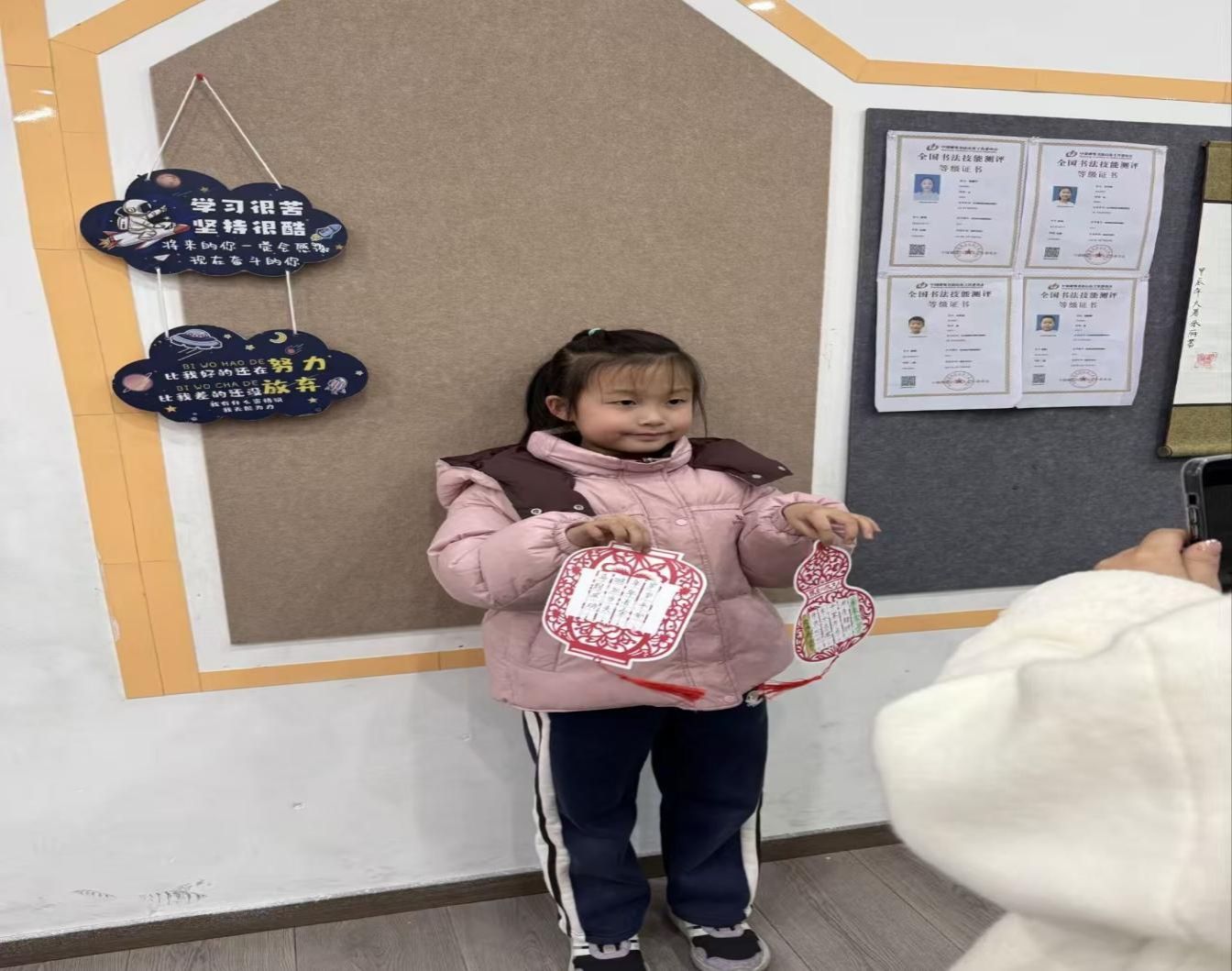 书写完成后,孩子们兴奋地举起自己的作品展示,穿粉色棉衣的小女孩手持红彤彤的书法挂件,脸上洋溢着自豪的笑容。教室的墙上,“学习很苦 坚持很酷”的标语格外醒目,一旁的荣誉栏里整齐张贴着孩子们的书法考级证书,无声诉说着平日的努力。此次活动特意设计了新春主题字帖,将生肖文化、吉祥寓意与书法练习结合,既锻炼了孩子们的书写能力,也让他们在实践中了解了春节习俗。