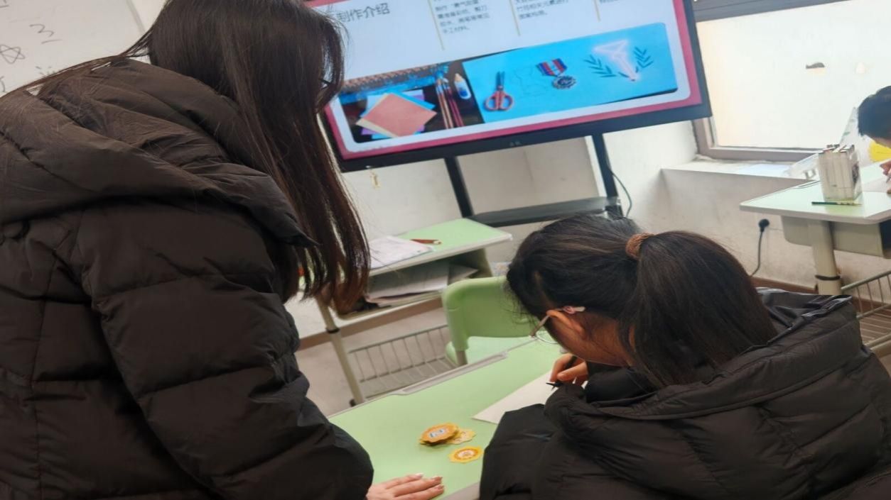 在整洁明亮的教学空间内,授课队员正俯身对学生进行一对一指导。学生专注于案头创作,将创意构思转化为具体的艺术表达。队员通过细致的示范与精准的点拨,为学生的创作实践提供专业支持,有效激发了学生的艺术潜能。