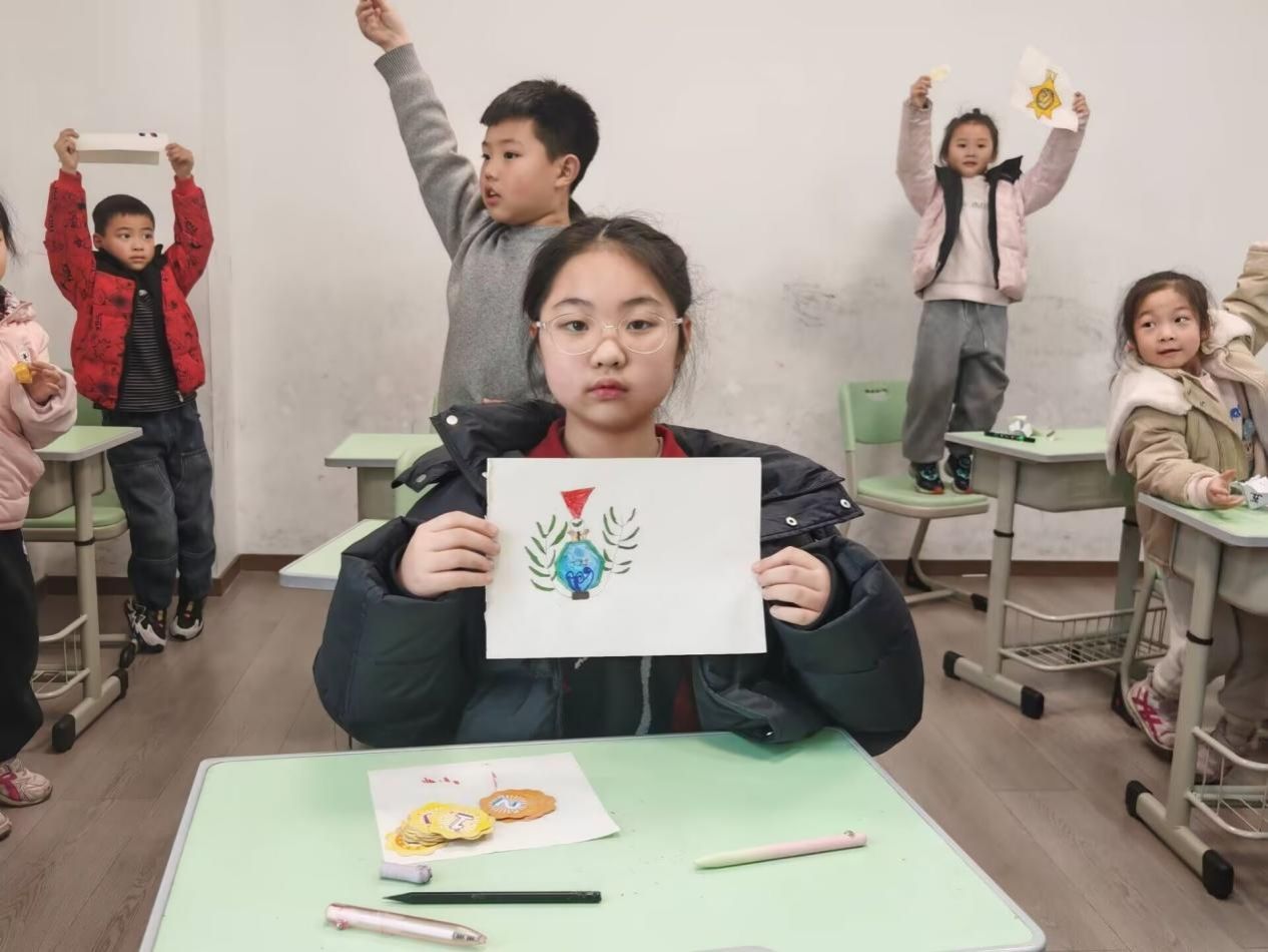 在手工艺术成果展示环节,学生们纷纷高举亲手完成的手工作品。无论是色彩饱满的绘画作品,还是精巧别致的徽章设计,都充分展现了学生的创造力与动手能力。学生们自信的神态与饱满的创作热情,不仅是对课堂学习成果的生动呈现,更彰显了素质教育背景下学生综合素养的全面提升。