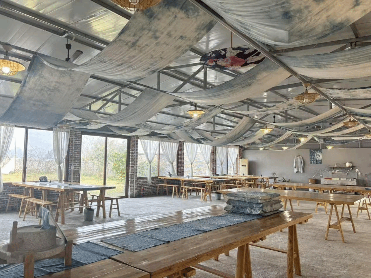 吾乡非遗手作艺术坊以传承蓝染技艺为核心,是当地推广传统手工艺的重要阵地。坊内陈列着从染料原料到成品服饰的全流程展品,靛蓝染料的醇厚香气与手工织物的质朴纹理交织,为实践活动打造了鲜活的文化课堂。