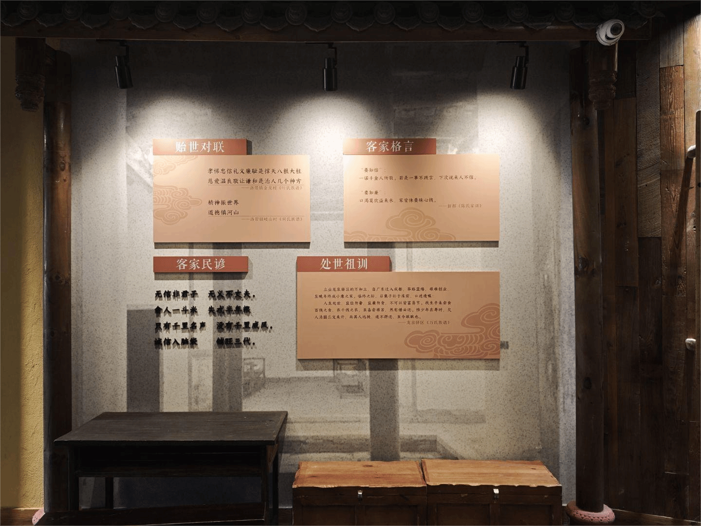 在模拟客家传统“中堂大厅”的展厅内,队员们见证了客家文化无与伦比的魅力。厅内陈设着清代木制神龛、民国桌椅茶几、楹联门板等旧物,生动再现了客家人昔日聚族议事、恪守礼制的家族生活场景。特别是“迁川议事”情景雕塑,深刻反映了客家人重大决策前慎终追远、尊崇宗法的家族文化,让队员们对客家重视族谊、恪守规矩的传统有了直观认识。