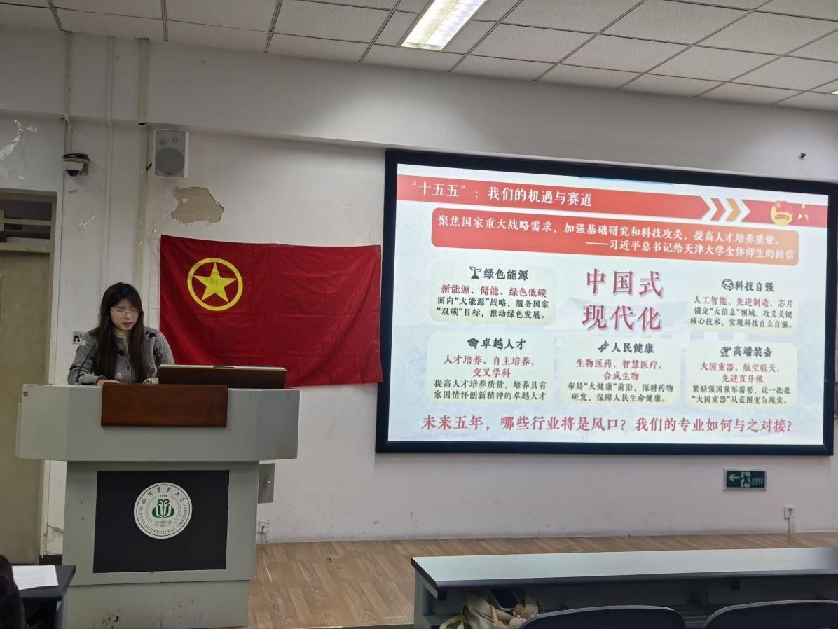 随后,校青马班学员胡咏悦围绕“学习全会精神,共绘‘十五五’蓝图”主题进行宣讲。她系统解读了《中共中央关于制定国民经济和社会发展第十五个五年规划的建议》,并结合自身学习体会,鼓励团员青年坚定理想信念、锤炼过硬本领,牢牢把握听党话、跟党走的青春航向。