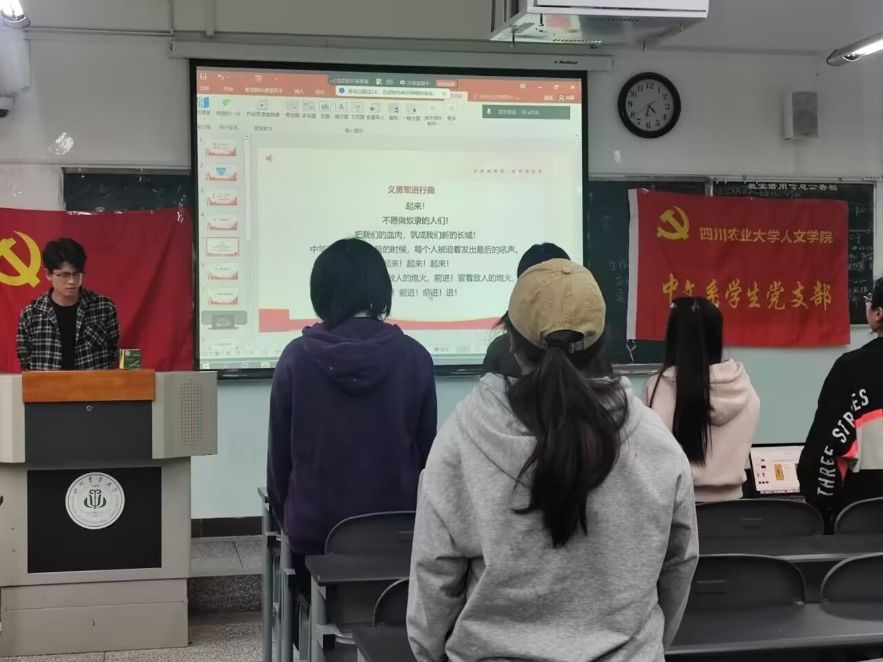 活动在庄严的国歌声中拉开序幕。全体同学肃立齐唱国歌,展现了青年党员昂扬向上的精神风貌。