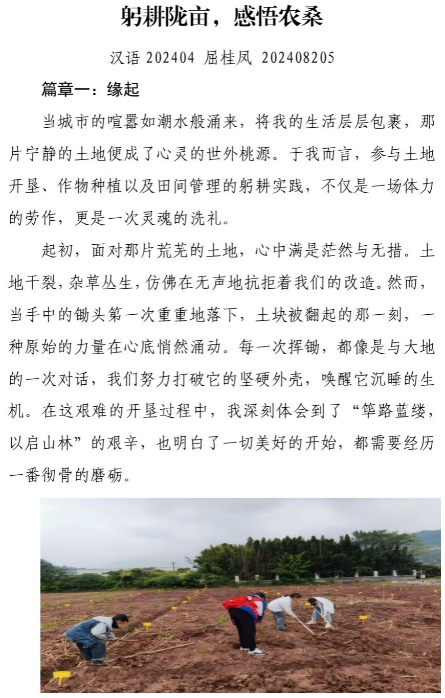 活动期间,同学们积极参与,围绕躬耕实践中的所见所感、所悟所思,撰写了一篇篇饱含真情的征文。如汉语202404班屈桂凤在《躬耕陇亩,感悟农桑》中,以细腻的笔触描绘了从面对荒芜土地的茫然无措,到挥锄开垦时与大地对话的深刻体验,展现了躬耕实践对灵魂的洗礼;汉语202403班任诗佳在《在那片快乐的田野上》里,记录了从带着浪漫想象踏入田野,到在泥泞与汗水里收获心安与快乐的真实感悟。