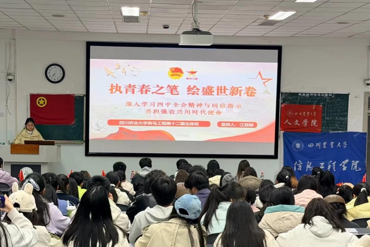 活动伊始,本次班团活动在一阵嘹亮的歌声中拉开序幕。学习全会精神,共绘“十五五”蓝图。活动前期,信息工程学院开展了“深悟全会精神”逐光系列主题二课活动,并在现场进行了成果展示。班团活动现场,校青马班第十二期主体班学员江亚婷带领同学们深入学习全会要义。