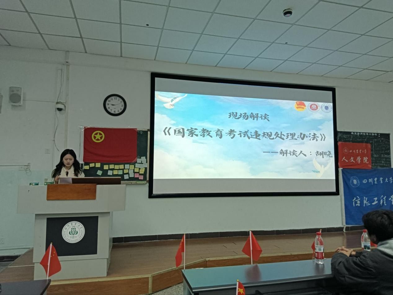 严明考风考纪,筑牢诚信防线。在这一主题下,现场播放小班成员拍摄的诚信考试警示片,信息工程学院团委副书记胡晓现场解读《国家教育考试违规处理办法》,主持人带领同学们进行诚信考试现场宣誓,以实际行动强化诚信意识。