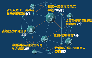 学院坚持以教学改革为核心,以课程建设为抓手,推动人才培养质量持续提升。获批省级及以上一流课程和示范课程等4门,校级一流课程和示范课程20余门,全国农林高校课程思政优秀案例2个。获批省级教改项目立项5项、教育部产学研协同育人项目5项、中国学位与研究生教育学会研究课题2项、研究生案例库建设项目1项。主编/协编教材4部,其中副主编“十四五”国家级规划教材1部,主编四川省“十四五”规划教材1部。